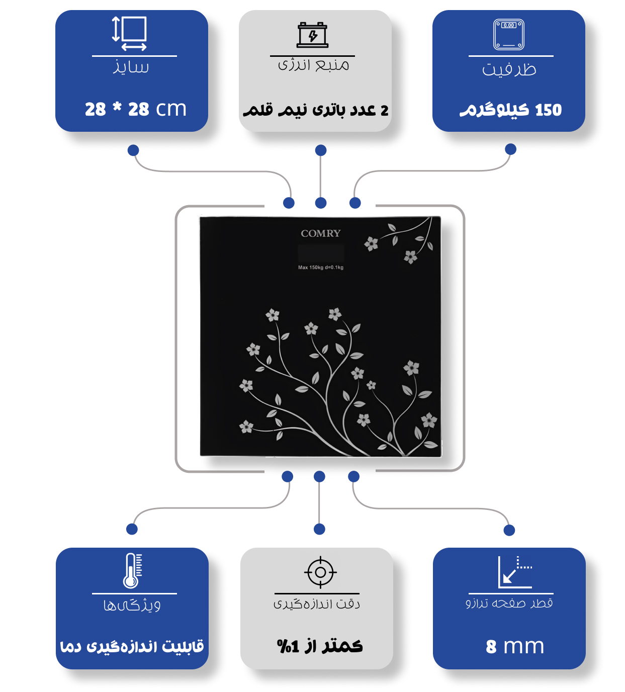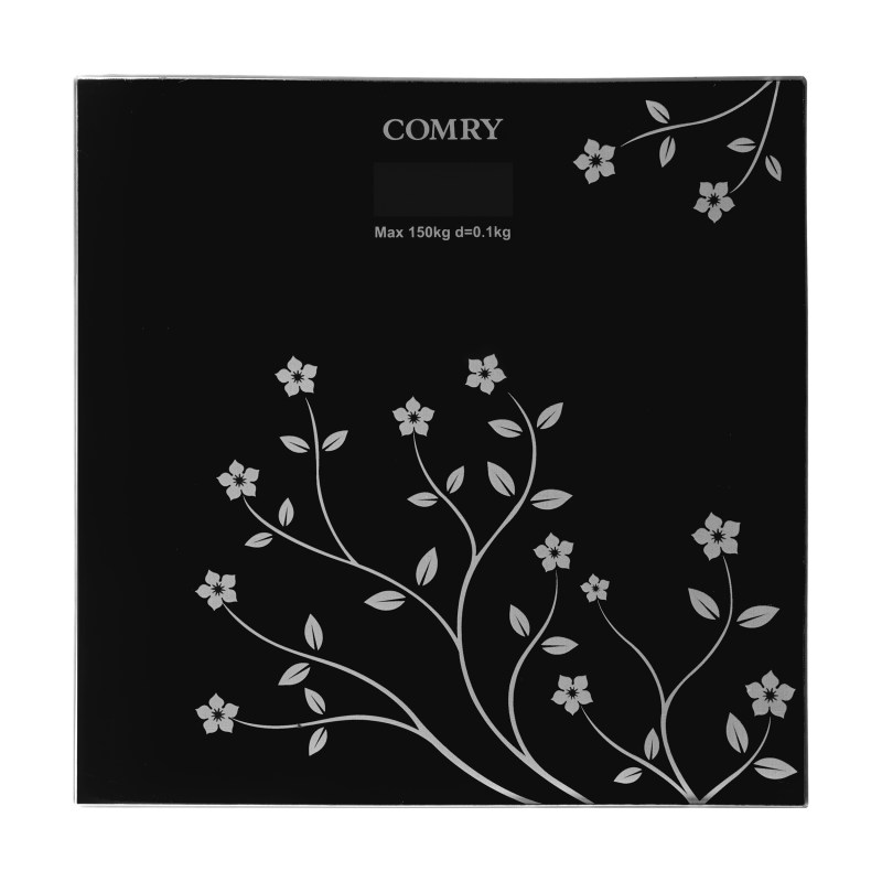 ترازو دیجیتال کٌمری (Comry) مدل گل (flower) حداکثر ظرفیت 150 کیلوگرم و ویژگی های آن نشانگر میزان باتری، دما و نمایش وزن در واحد کیلوگرم است.