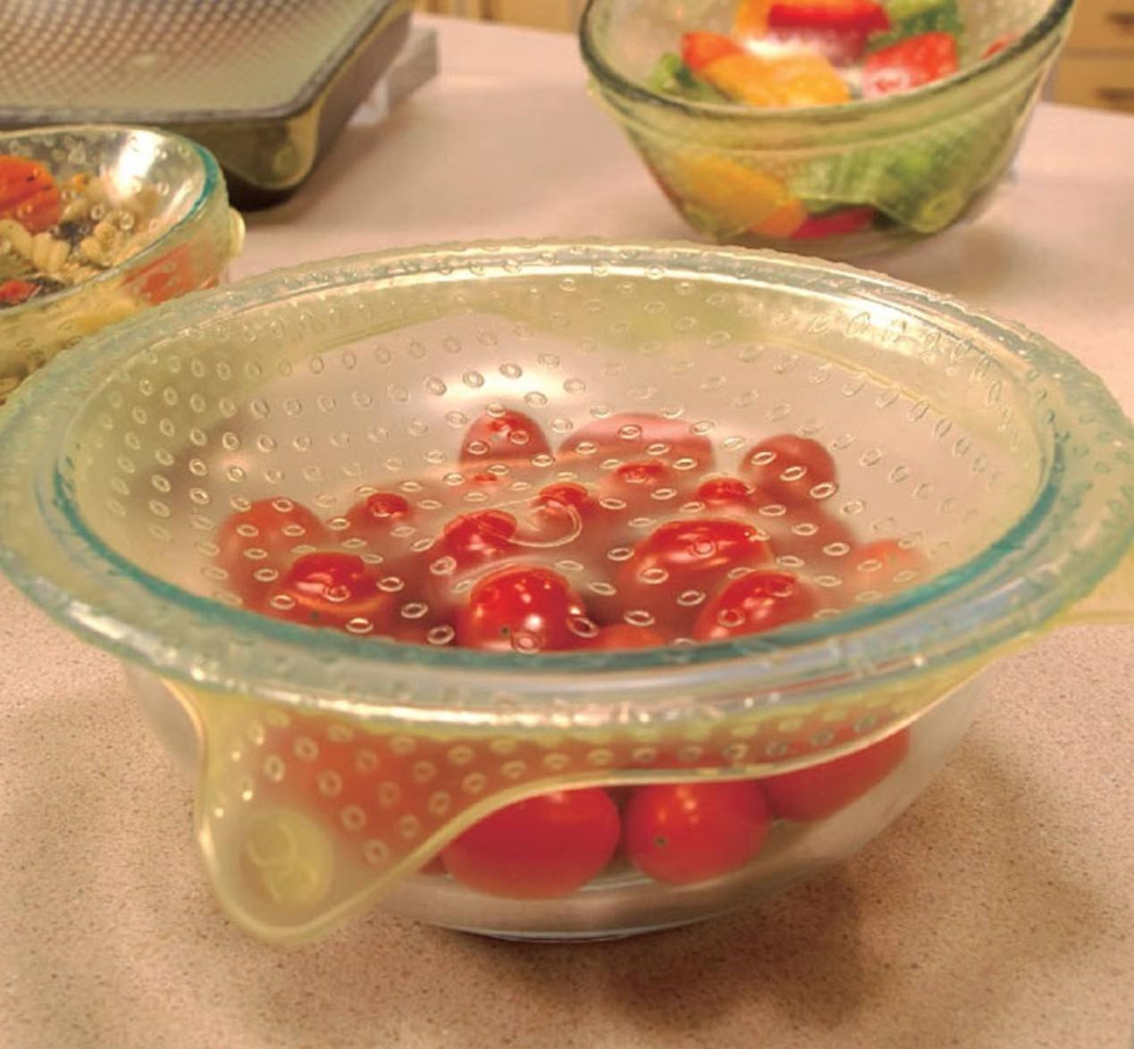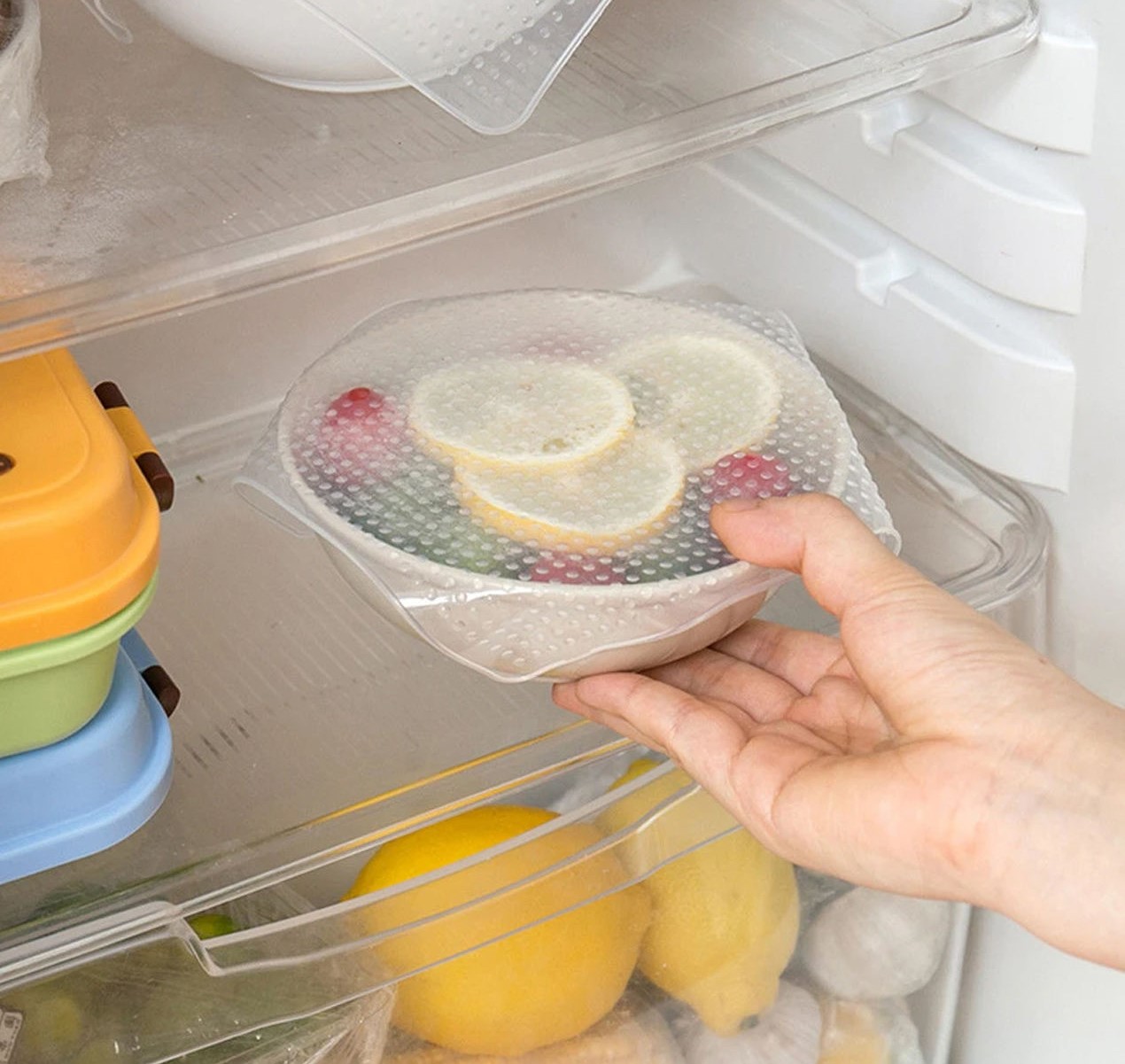 درپوش محافظ غذا از جنس رپوش های سیلیکونی با مقاوت حرارتی و قابلیت انعطاف پذیری فوق العاده در 4 سایز متفاوت، تقریبا تمام ظروف آشپزخانه شما را پوشش می دهند. این محصول بر روی انواع ظروف با شکل های مختلف به راحتی قرار گرفته و از تبادل هوای میان محیط و محتویات ظرف جلوگیری می کند تا طراوت و تازگی غذا، سالاد، سبزیجات، میوه ها و …حفظ شود. همچنین قابل استفاده در فریزر و مایکروویو است. این محصول قابل شستشو است و می توان آن را در ماشین لباسشویی و ظرفشویی شست.