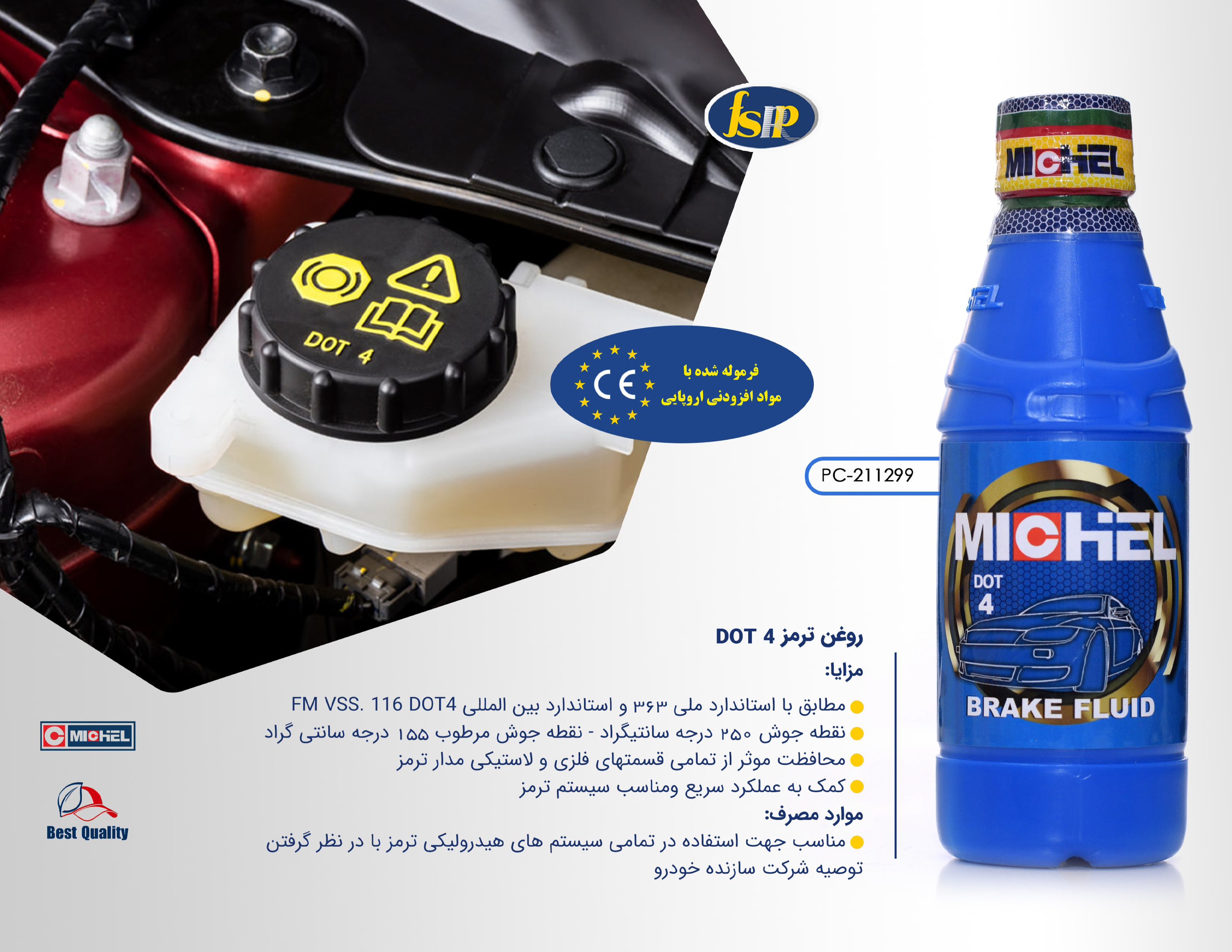 مایع ترمز مایکل مدل DOT4 با پایه غیر نفتی و مطابق با دو استاندارد ملی ۳۶۳ و استاندارد بین المللی FM VSS. 116 DOT4 تولید و عرضه می شود. همچنین با دارا بودن نقطه جوش ۲۵۰ درجه سانتی گراد و نقطه جوش مرطوب ۱۵۵ درجه سانتی گراد کارایی مناسبی را برای انواع خودروها ارایه میکند.
