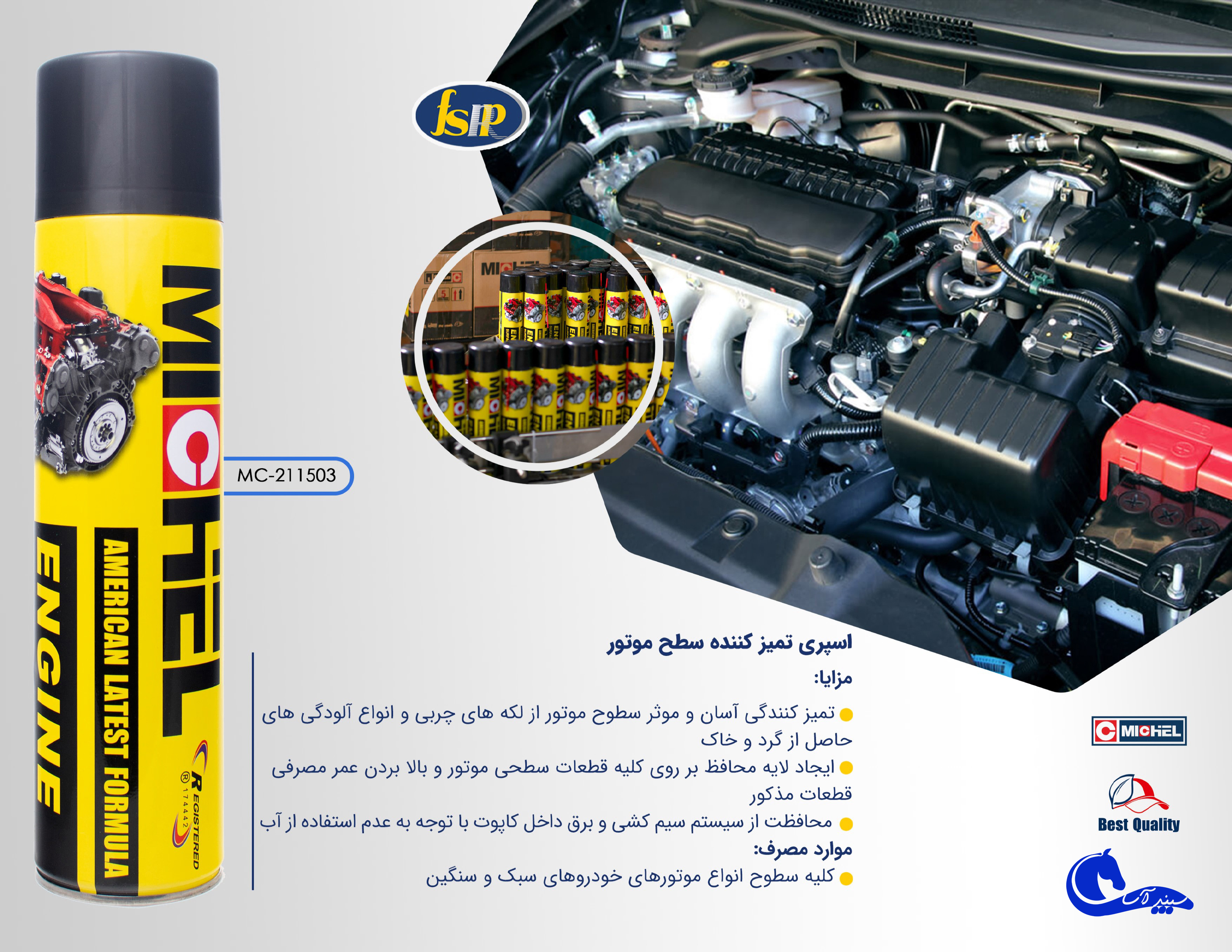 اسپری موتورشوی michel، که برای نظافت سطح بیرونی موتور و متعلقات آن ساخته شده است. بدیهی است که بهمرور زمان موتور خودرو دچار آلودگی و کثیفی میشود که متشکل از گردوخاک و روغن و گریس است. تمیز کردن این آلودگیها به دلیل ماهیت چربی و گریس کار آسانی نیست و بسیاری از افراد به سراغ موتورشویی در کارواش میروند که این کار هم معایب خود را دارد زیرا به دلیل فشار آب قوی کارواش ممکن است قسمتهای برقی خودرو مانند شمعها و اتصالات و سوکتها خیس شده و آسیب ببینند. از این رو شرکتهای تولیدکننده محصولات نگهداری و نظافت خودرو اسپریهای نظافت موتور را روانهی بازار کردهاند. این اسپری تمیز کننده موتور عملکرد خوبی در این زمینه دارد. برای استفاده از این محصول با توجه به دستور استفادهی روی قوطی باید ابتدا موتور خودرو را روشن کرد و بعد از 5 دقیقه خاموش نمود. سپس بایستی فیلتر هوا را خارج نموده و کاربراتور و سویچ توزیع برق را پوشاند. قبل از استفاده قوطی را تکان دهید و محصول را بر روی سطوح خارجی موتور اسپری کنید (از اسپری کردن بر روی اتصالات برقی خودداری کنید) حال بعد از 5 دقیقه محلول اسپری شده را با جریان آب شستشو دهید.